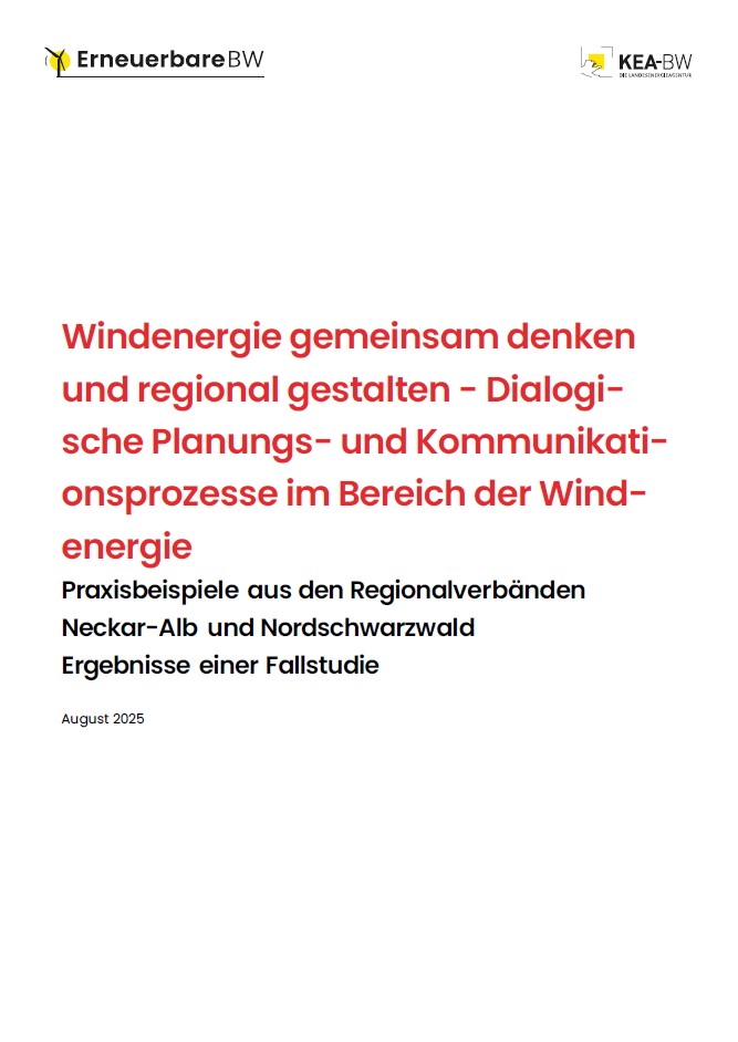 Die Fallstudie “Windenergie gemeinsam denken und regional gestalten - Dialogische Planungs- und Kommunikationsprozesse im Bereich der Windenergie” beleuchtet anhand von Praxisbeispielen aus den Regionalverbänden Neckar-Alb und Nordschwarzwald, wie kommunale und regionale Akteure beim Ausbau der Windenergie zusammenarbeiten. Auf Basis von Interviews mit Kommunen, Regionalverbänden und Projektierenden zeigt die Studie, welche Rolle Kommunikation, klare Zuständigkeiten und transparente Prozesse für eine erfolgreiche und akzeptierte Planung spielen.