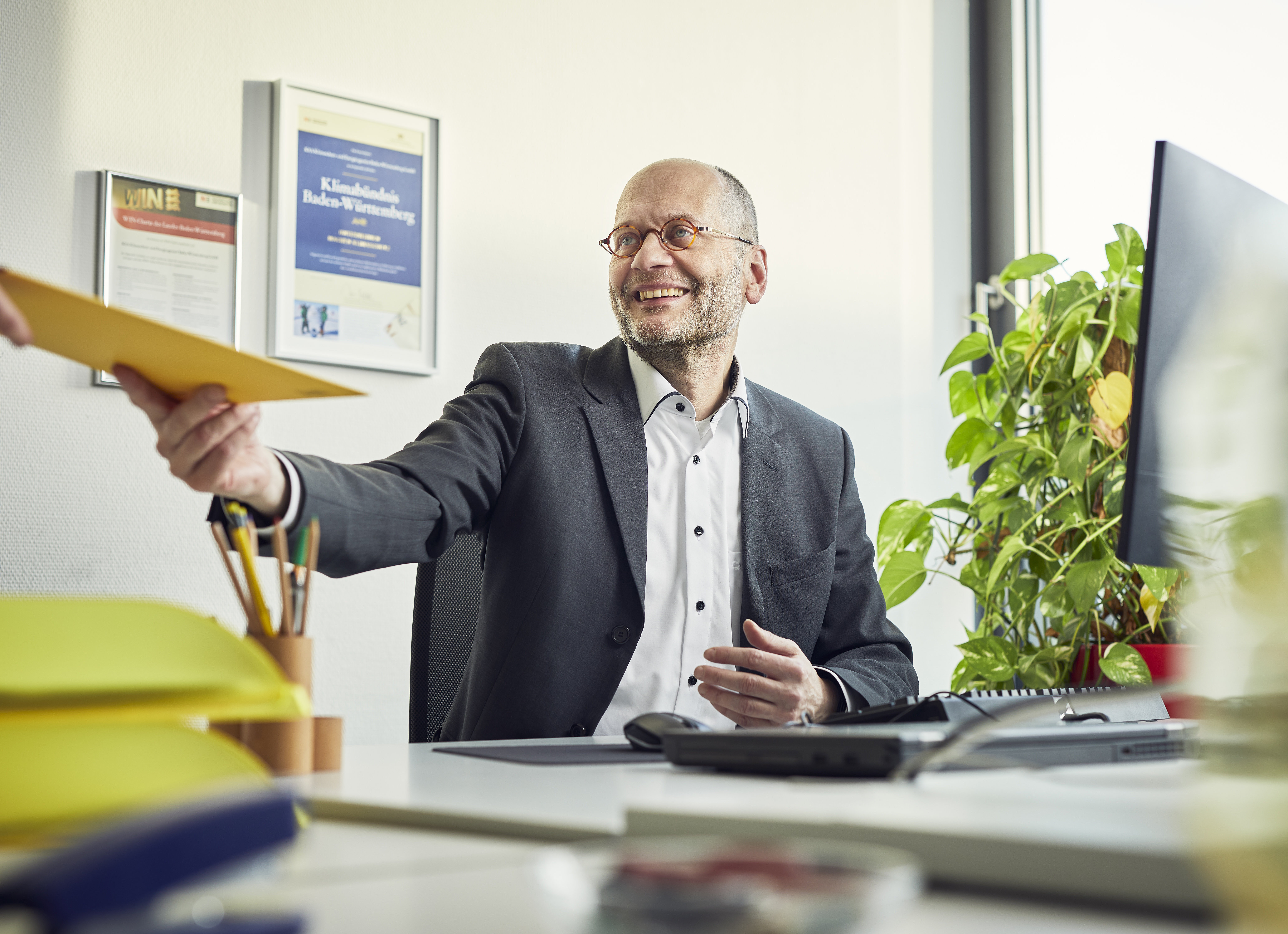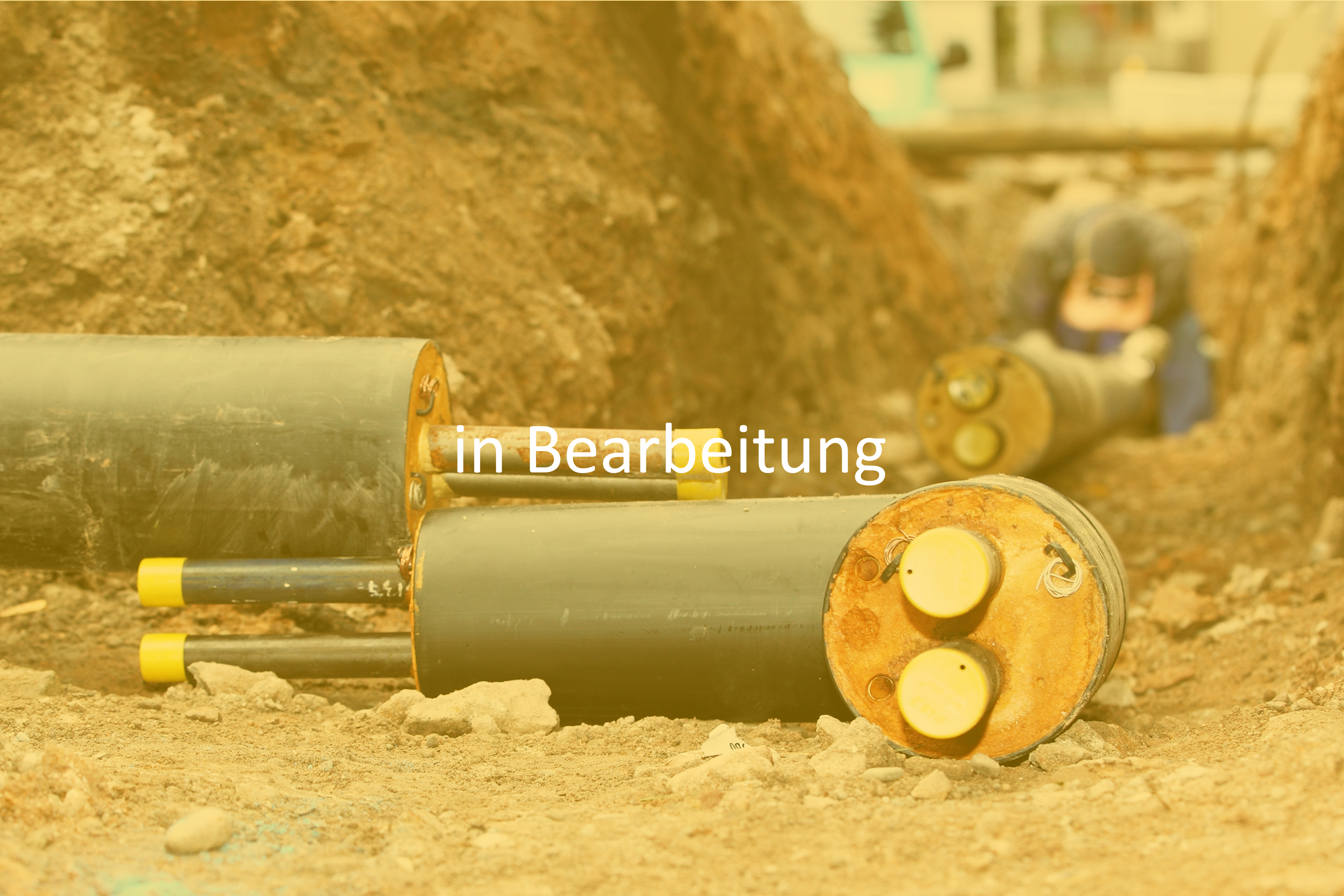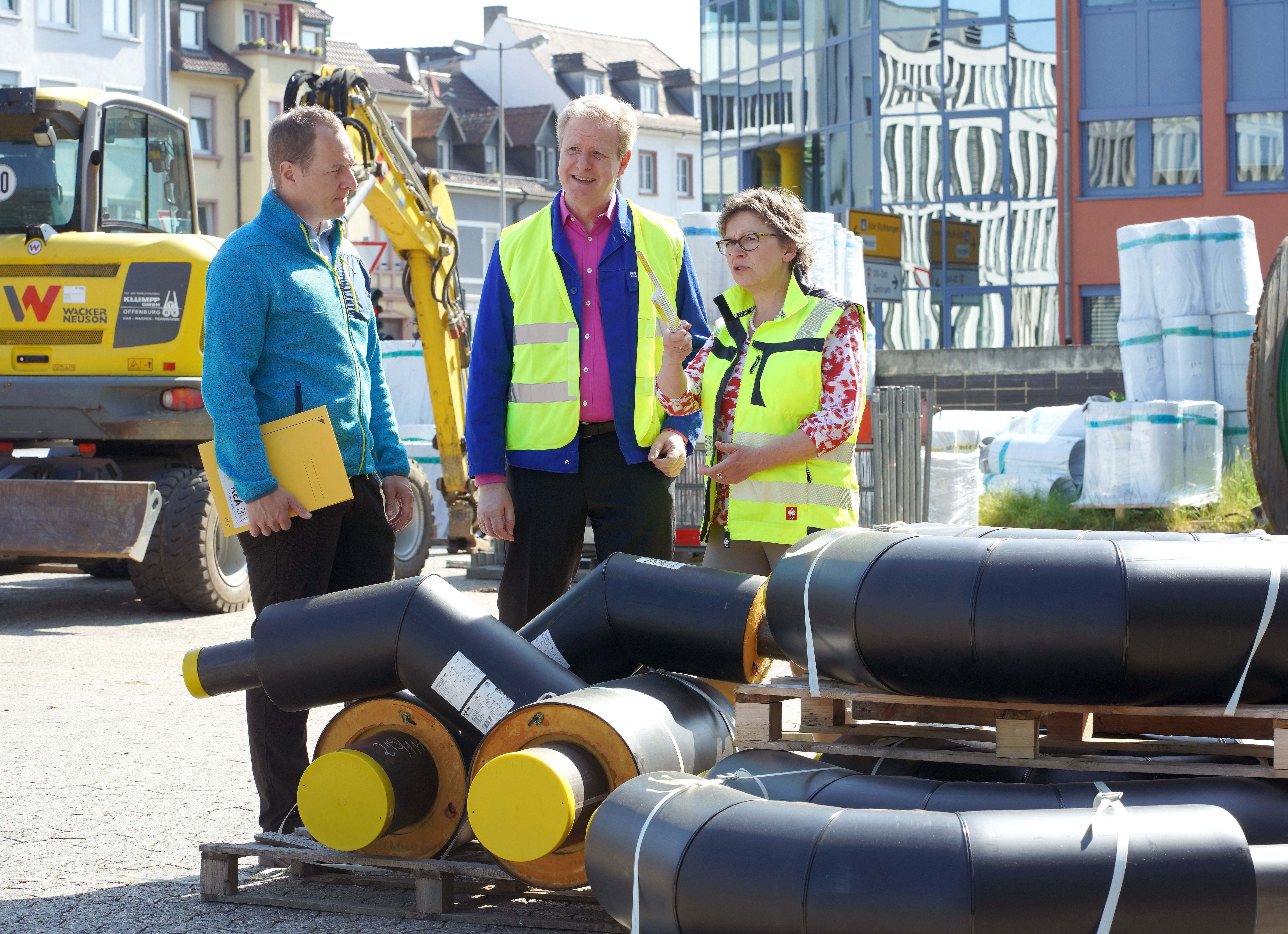 Drei Personen stehen auf einer Baustelle vor gestapelten, isolierten Rohren für ein Wärmenetz. Eine Frau mit Bauhelm zeigt auf ein Bauteil, während zwei Kollegen in gelber Arbeitsplanung zuhören.